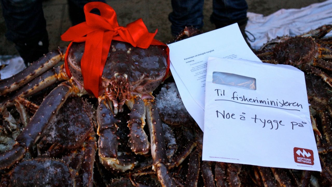 27/10/2010 Stopp kongekrabben Fiskeridepartementet invadert av kongekrabber Neptune Network markerte i dag sin uenighet mot den politikk som Fiskeriministeren fører i kongekrabbesaken. Ved å slippe løs over hundre levende kongekrabber i depertamentets inngangsparti skulle dette symbolisere innovasjonen fra øst. Les saken